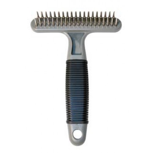 Grooming rake with a well designed, anti slip handle and two rows of metal pins.