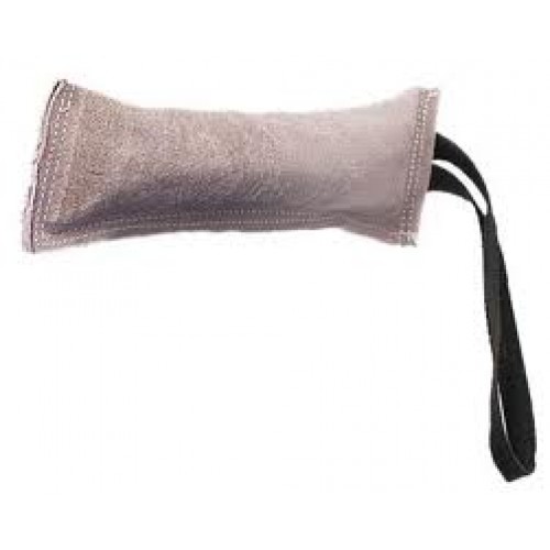 Puppy tug made of strong, chrome tanned leather with soft padding, covered with leather. Extremely durable. There is a grip on one end. Length 25 cm, app. 18 cm circumference.